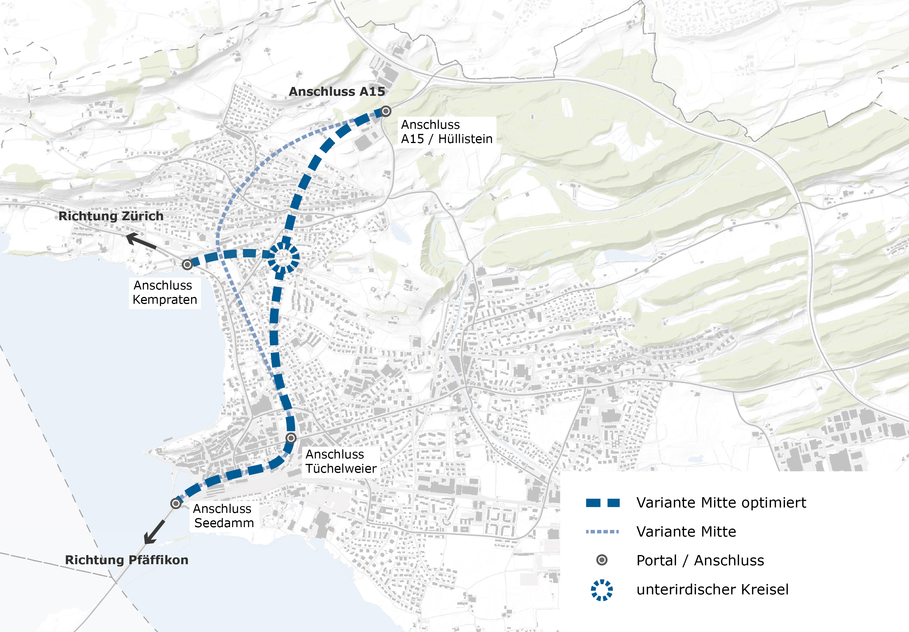 Im Jahr 2023 sprach sich die Stimmbevölkerung von Rapperswil-Jona in einer Konsultativabstimmung für einen Stadttunnel zwischen Seedamm und dem Autobahnanschluss Hüllistein aus. Gleichzeitig favorisierten die Abstimmenden die Variante Mitte mit Anschlüssen in Kempraten und Tüchelweier. Seither wurde das Projekt Mobilitätszukunft Rapperswil-Jona weiterentwickelt. In die Planungsarbeiten auf Seiten der Stadt und des Kantons sind neuste Erkenntnisse eingeflossen. Ergänzende Vorschläge wurden geprüft. In einem nächsten Schritt werden weitere Abklärungen gemacht, bevor ein Vorprojekt ausgearbeitet wird.